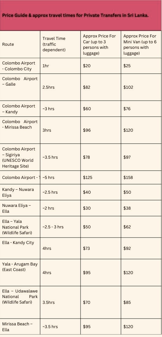 2025 Price Guide & approx travel times for Private Transfers in Sri Lanka.